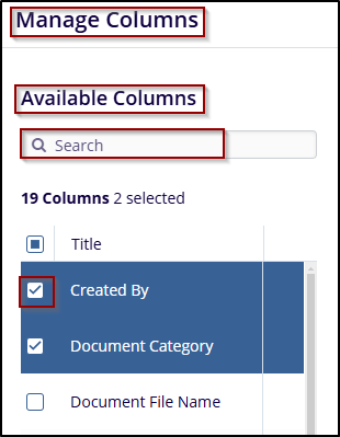 Users can use the search bar to find columns. Check the checkbox available for the title that the user wants to add to their view.
