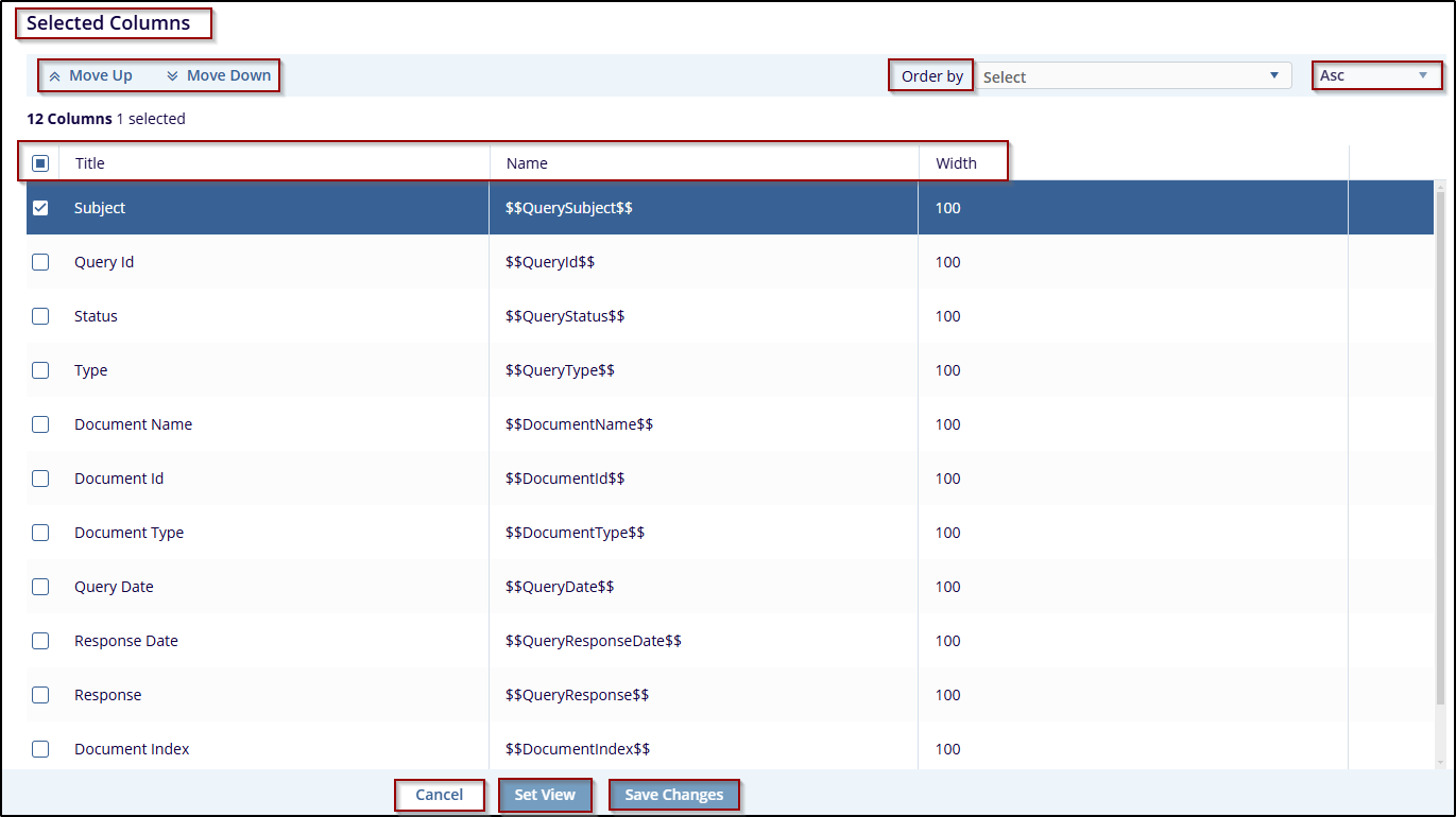 - In the Selected Columns section, the user can use the Move Up and Move Down buttons to reorder the columns in the selected list. For each selected column, the user can see its Title, Name, and Width.