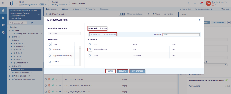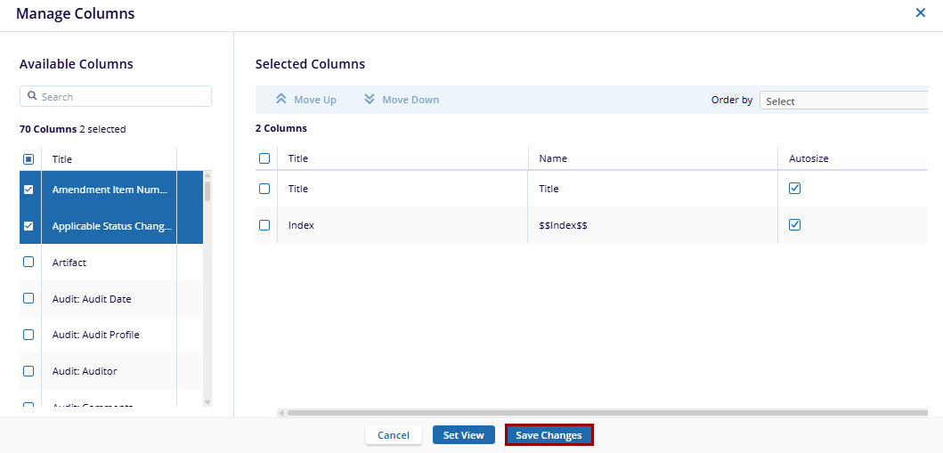 - In the Selected Columns section, the user can use the Move Up and Move Down buttons to reorder the columns in the selected list. For each selected column, the user can see its Title, Name, and Width.
