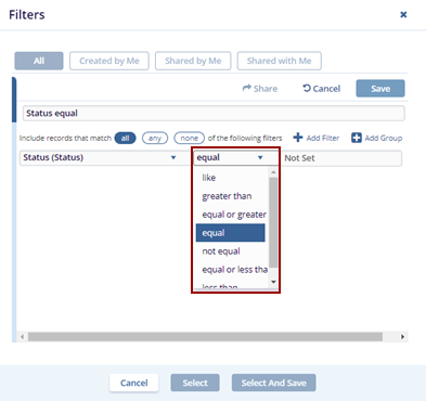 - Configure the filter criteria and click the Save button on the top right side of the Filters pop-up window.