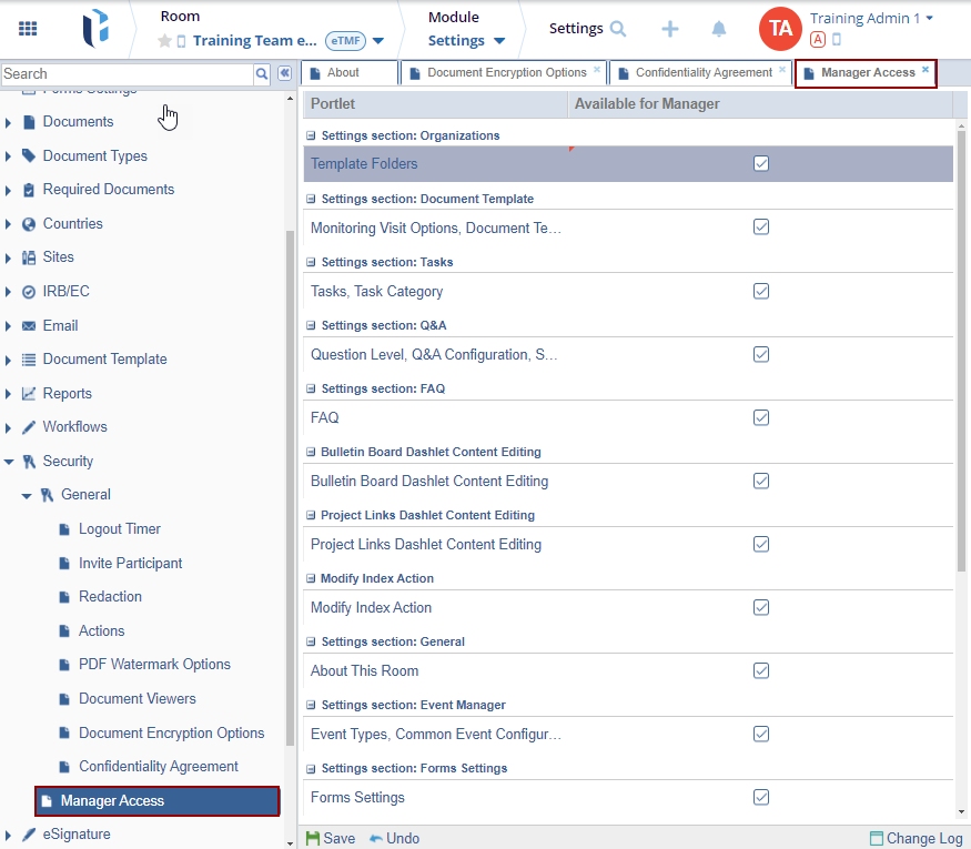 The Manager role can be customized directly from this menu. Checkboxes allow you to enable or disable specific access rights and privileges associated with the role, tailoring it to your needs.