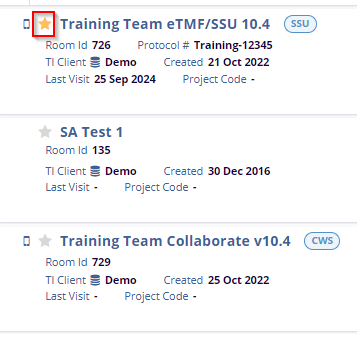 - On the left side of the Home Page, users can view a list of all assigned rooms, along with detailed room-specific information. Key details, including Room ID, Creation Date, Last Visit, Protocol, TI Client, and Project Code, are displayed for convenient reference. Users can also mark a room as a favorite by clicking the Star Icon.