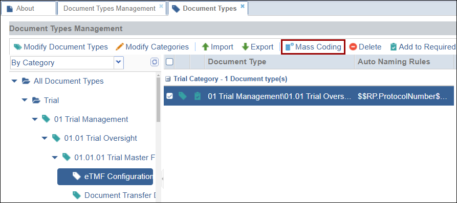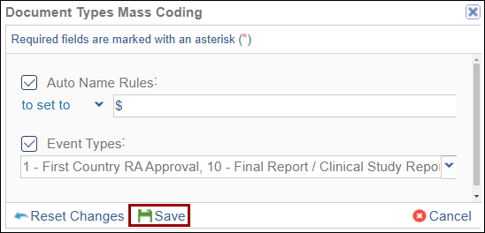 On the Document Types Mass Coding window, specify the Auto Name Rules and Event Types.
