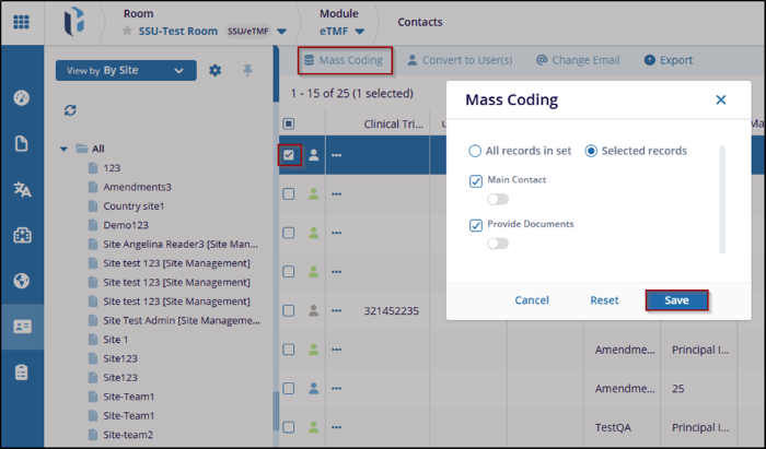 The Mass coding functionality allows users to apply metadata updates in bulk to all or selected contacts.