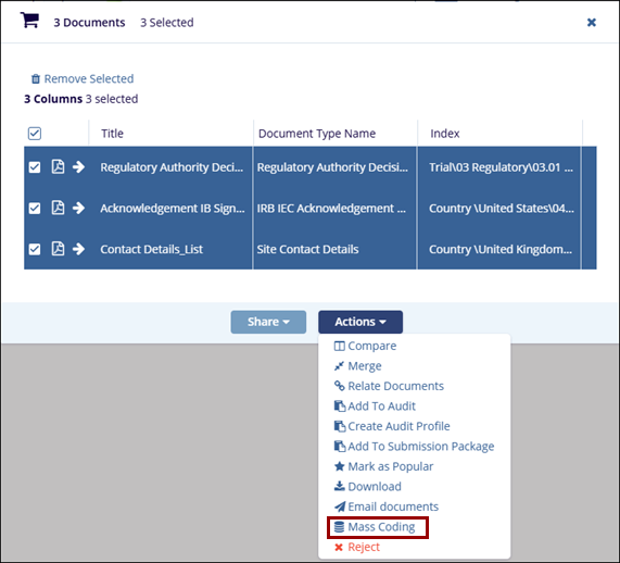 The Mass Coding function, allows the user to apply metadata to multiple documents at the same time. If the Causality Tracking feature is enabled in the room, then Mass Coding will be disabled.