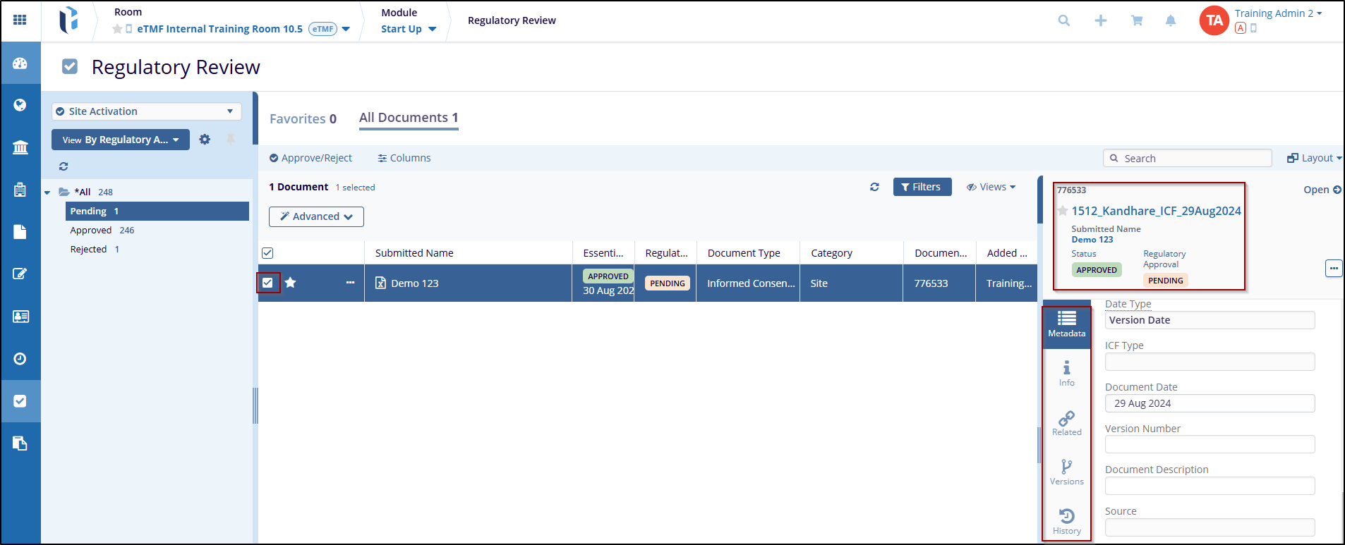 - Select a document by clicking on the checkbox and the Metadata Panel on the right-hand side will open, displaying detailed information about the selected document.