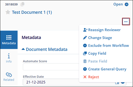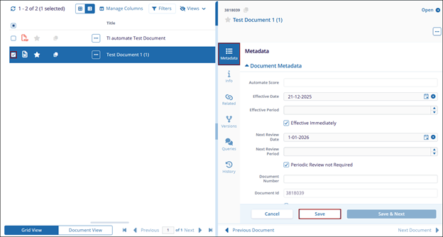 The Metadata tab in the Metadata panel displays all details entered during the document addition process. Users with the required permissions can edit metadata fields.