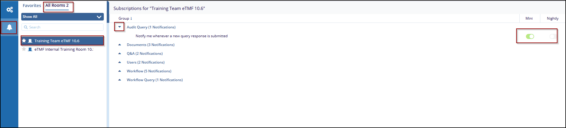 Select the desired room from the list of studies in the left pane of the Notifications panel. Using the options grid on the right of the Subscriptions window, you can select which notifications you would like to receive. Administrators can choose which notifications are available for you, and they can make some choices default or mandatory: