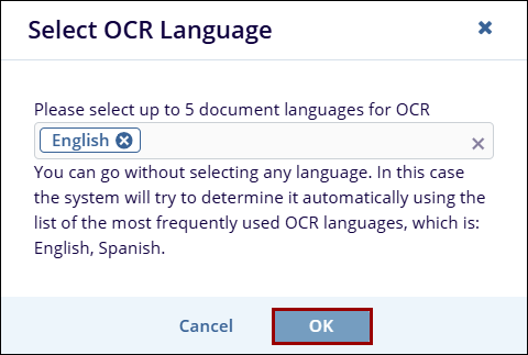 - On the Select OCR Language pop-up, select up to 5 languages for the OCR.