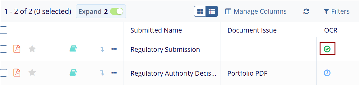 - Once OCR is successfully reverted, the OCR column within the documents grid displays the corresponding status.