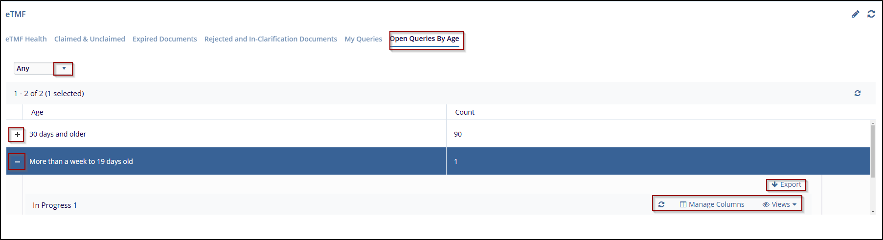 - Navigate to the eTMF dashboard and select the Open Queries by Age tab.