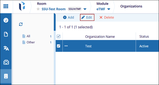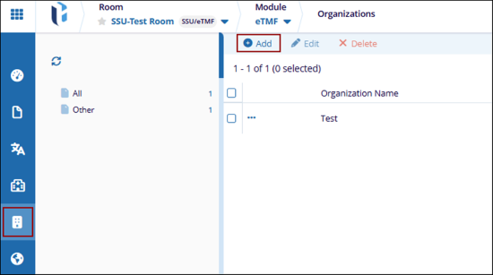 - In the eTMF module, go to the sidebar and click on the Organizations modal.