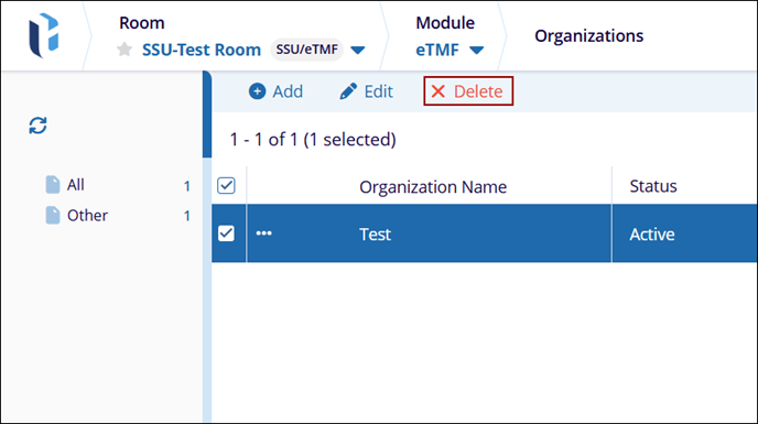 The Organizations feature simplifies the management of organizations within the eTMF or document management system. It provides comprehensive control over organizational data, allowing users to add, manage, and track organizations at the room level while linking relevant documents directly to each organization. The Organizations modal within eTMF ensures an organized and efficient workflow for managing organizations and their associated documentation from a centralized interface.