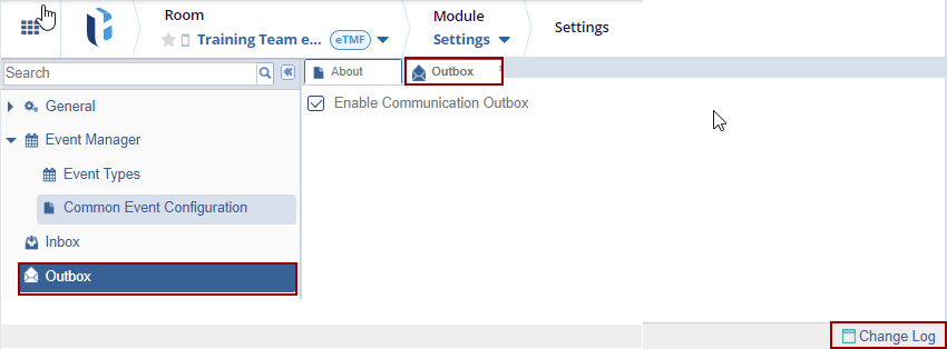 The Change Log option, located at the bottom right of the screen, displays a record of the Outbox. It includes columns for Item Name, New Value, Old Value, Updated By, and Updated On (with the timestamp) and a Close button.