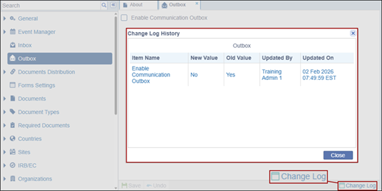 The Outbox Settings allows administrators to enable or disable the Communication Outbox feature. If enabled, users can access the Communications module from the navigation grid that supports an Inbox for receiving emails with document attachments and an Outbox for outgoing communications, along with the ability to send notification alerts. Additionally, it supports sending out notifications for communications.