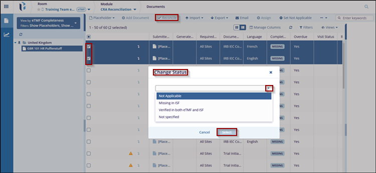 - Select the following option from the dropdown, such as: Not Applicable, Missing in ISF, Verified in both eTMF and ISF, Not specified