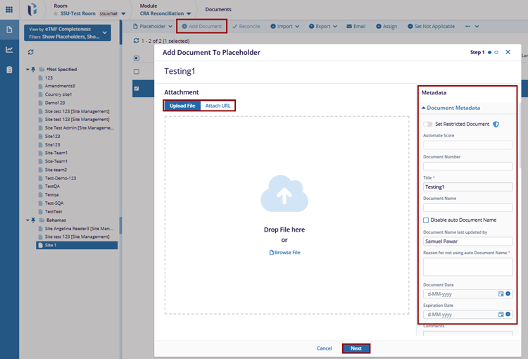 The Add Document refers to uploading a document or attaching a URL, such as an eTMF (Electronic Trial Master File) document. These documents may include queries, audits, or any other files that need to be added to placeholder.