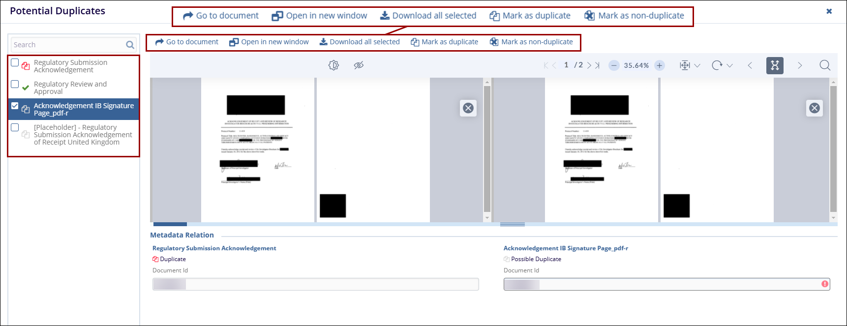 When the system identifies potential duplicates of an uploaded document, it is marked with a duplicate icon. Users can access the Potential Duplicates option from the dropdown menu to view and manage the identified documents.