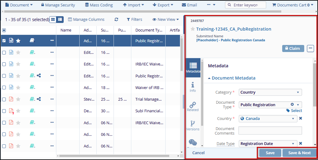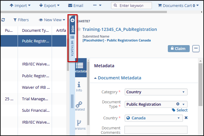 The Document Metadata panel allows users to view the document metadata and the document in separate panels in the eTMF/Document module.