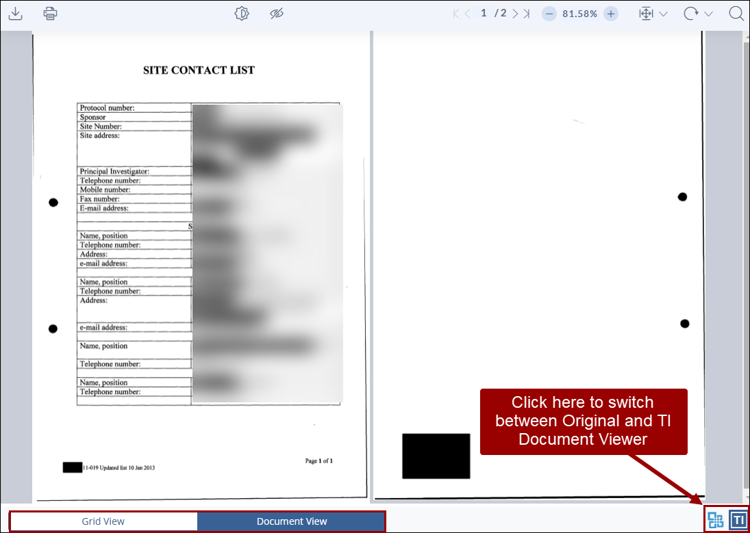 - Click on the Document View tab at the bottom of the grid. The Document and viewed in the Original as well as the TI Document Viewer.