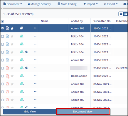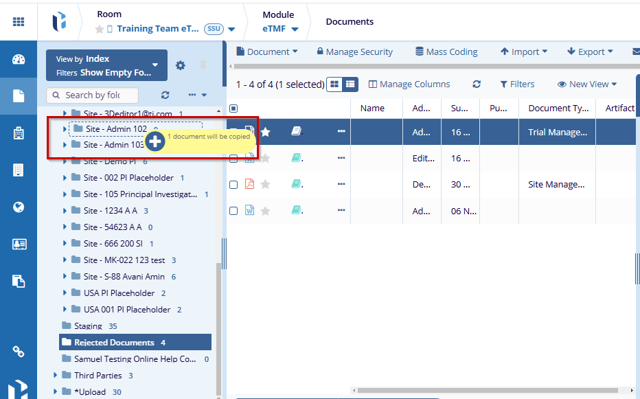 Users with necessary access permissions can drag and drop documents from one folder to another. Dragging and dropping documents across folders will not alter the metadata applied to the document. However, if a document is manually copied from one folder to another, users need to re-code the document.