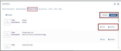 The Project Links tab displays links to various websites and resources used in the study, allowing team members quick access to important external content. Users with Editor-level permissions and above can create new links by clicking the Create button. Each link can be set as Private (visible only to the user) or Shared (visible to all users). This setup allows users to organize and manage external resources effectively.