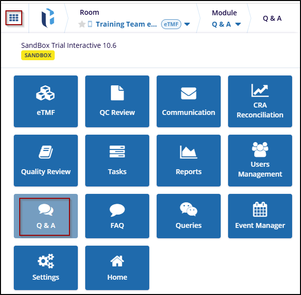 Users can access the Q&A module from the navigation grid in the upper-left corner of the screen.