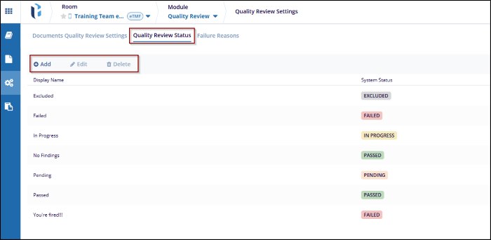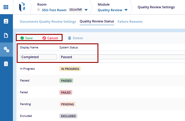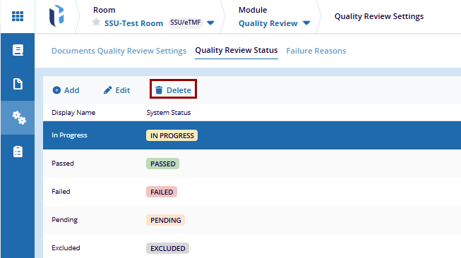 The Delete button is used to delete the available statuses, in the quality review setting.