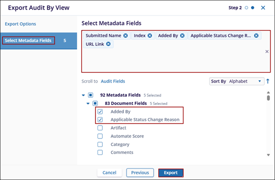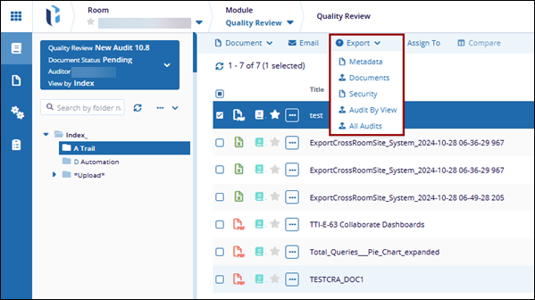 The Export option allows users to export Metadata, Documents, Security, Audit By View, or All Audits.