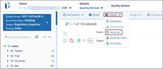 To export documents, click the Export dropdown and select the Security option.