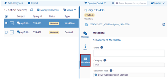 The Message tab within the query’s metadata panel displays the list of assigned users along with the message submitted by the query initiator. Query recipients can add responses and initiators can reply, add additional assignees, and mark the query as resolved when appropriate.