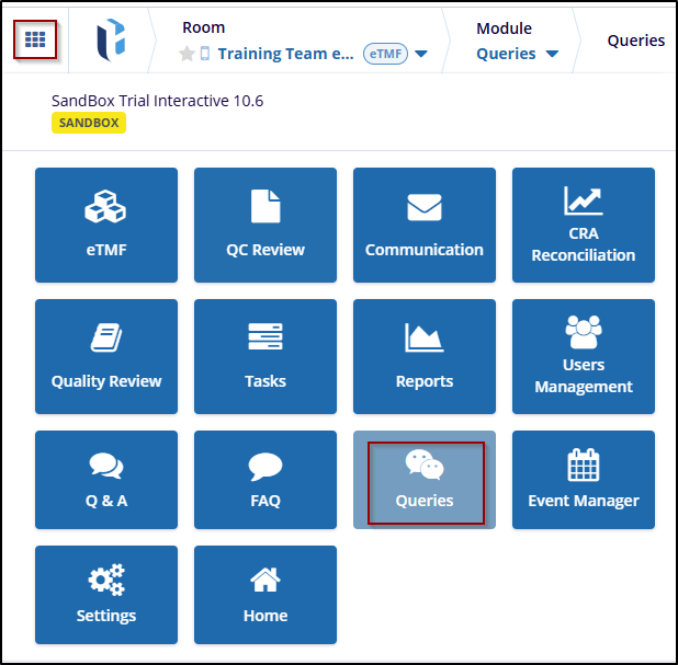 Users can access this module from the Navigation Grid in the upper-left corner of the screen, where the Queries Module is listed.