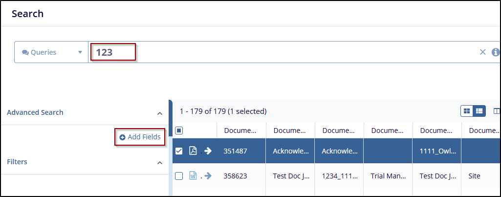 - If needed, click on Advanced Search and Add Fields to refine your search further, such as adding filters for document status or type.