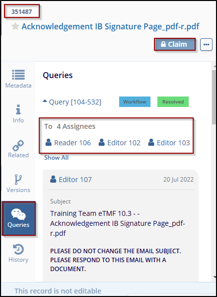- The query details display the list of assignees (e.g., Reader 106, Editor 102, Editor 103). You can review or assign tasks to users related to this query.