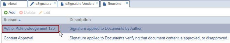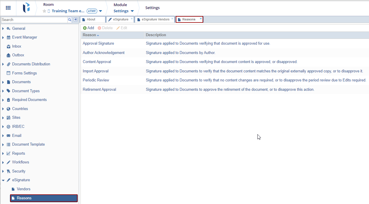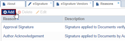 When e-signing a document, e-signers must specify the reasons for approving or declining it. Administrators can configure the available reasons for e-signature from this section.