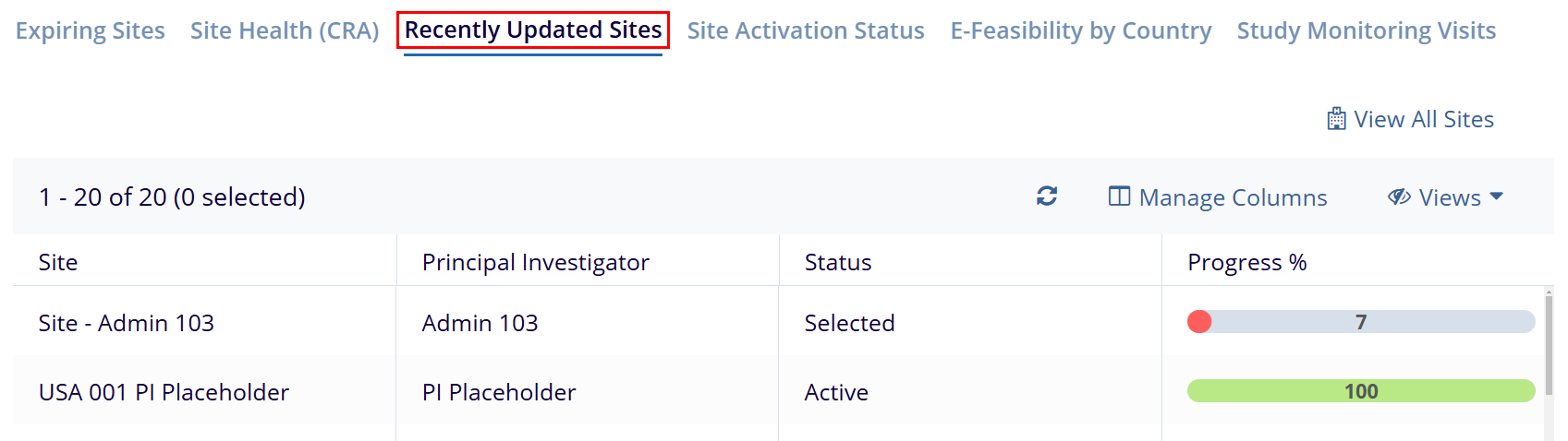 The Recently Updated Sites tab provides a list of sites that have recent updates, allowing users to monitor site progress and activity status. This tab displays details including Site, Principal Investigator, Status, and Progress %. Users can customize the display by managing columns, refreshing the data, and viewing all sites. This tab helps users keep track of site activity and status updates, which can be essential for ensuring that all sites meet project requirements.