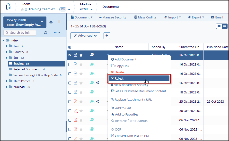 A new setting is added to support a Rejected folder within the eTMF for Room Administrators, and a new Document Rejection function is now available to Admins, Document Managers, and Room Managers. Any documents in the Upload, Inbox, Staging, and Rejected Folders are not considered to be Final. A Reason for Rejection dropdown is now available for workflow documents, and documents in the rejected folder/status are now excluded from eTMF health calculations.