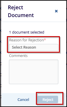 - Provide a rejection reason on the Reject Document pop-up and click on the Reject button.