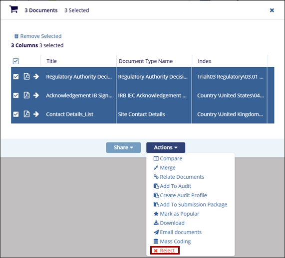 - On the Reject Document screen, add the rejection reason and click on the Reject button.