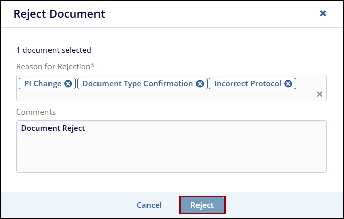 - On the Documents Cart window, click on the Actions dropdown and select the Reject option.