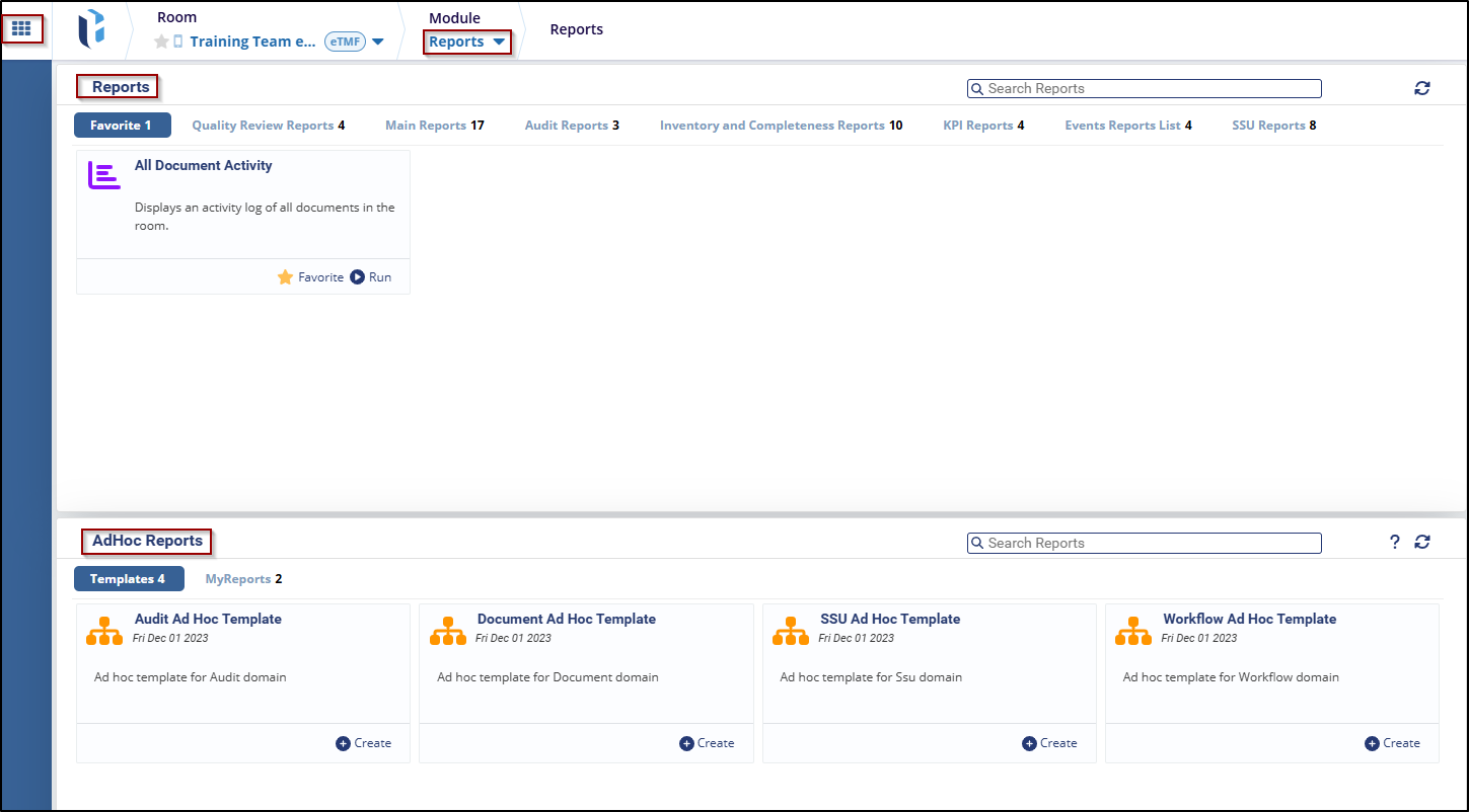 The Reports module provides activities and document actions, offering a summary of the reports. Users can access this module from the navigation grid in the upper-left corner of the screen, where the Report module is listed.