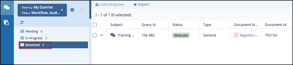 A Resolved folder contains queries that have been completed and marked as resolved. No further action is required.