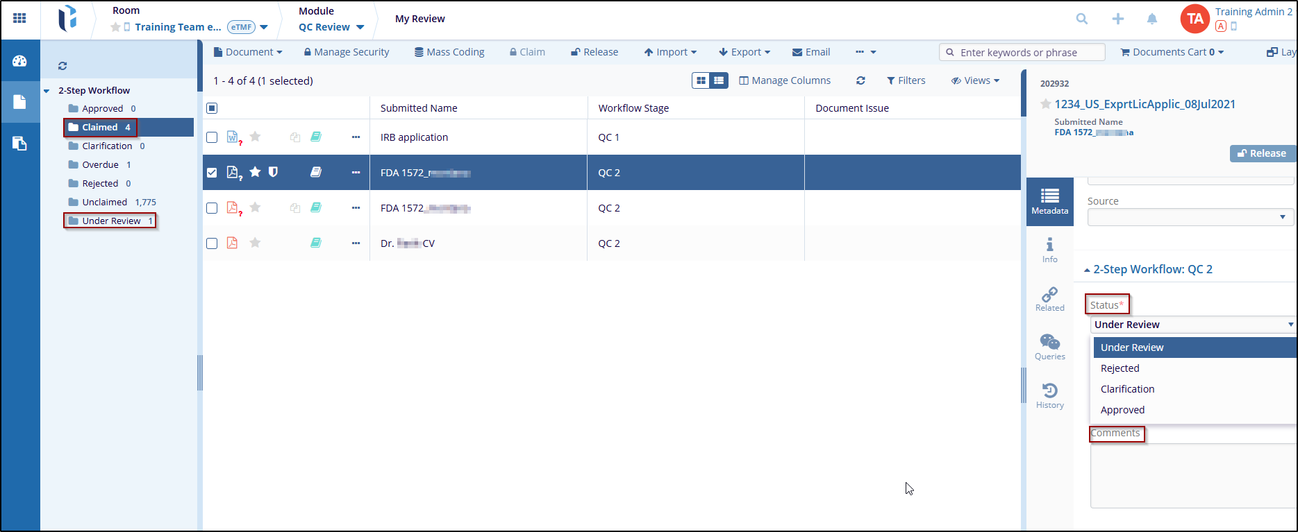 - At the right side of the screen, in the metadata panel, there is a workflow status area. This section is named for the workflow QC1.