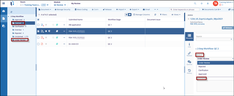 - At the right side of the screen, in the metadata panel, there is a workflow status area. This section is named for the workflow QC1.