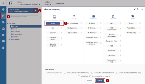 - Enter the required eTMF Room and click on the Documents module from the left-hand navigation panel.