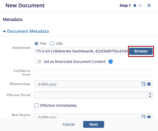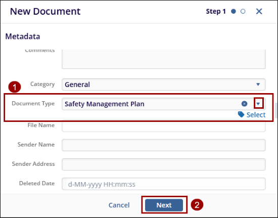 - Fill in the remaining mandatory metadata fields. Navigate to the Document Type field