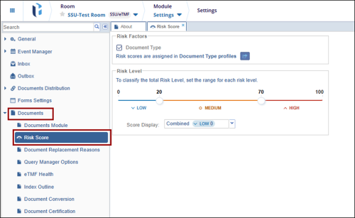 This section explains how to configure the Risk Score settings at the room level. This configuration enables risk scoring for documents and defines how documents are classified into different risk levels.