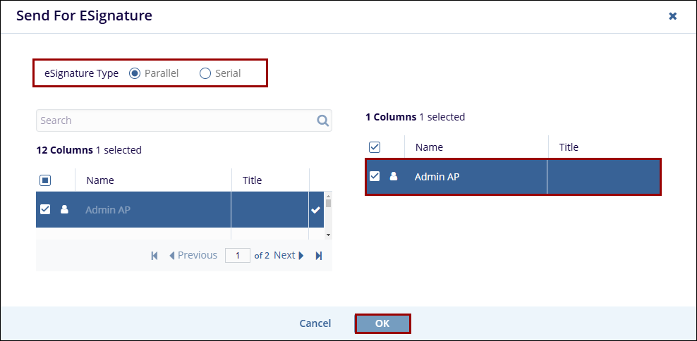 - On the Send for ESignature screen, select the eSignature type as Parallel or Serial.
