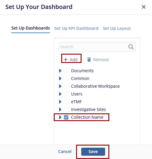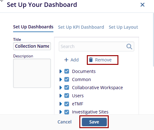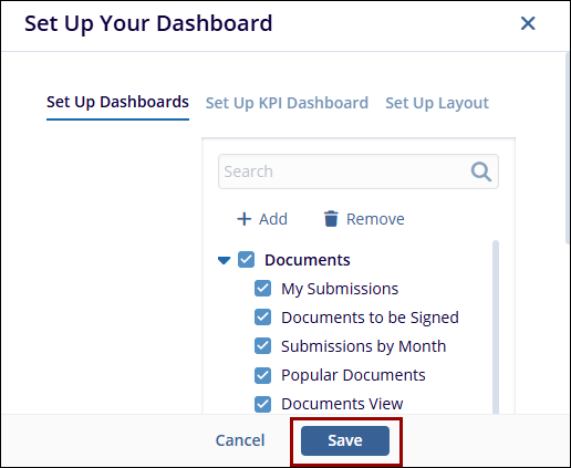 The Set-Up Dashboards allow users to customize their dashboards by adding, removing, or managing dashlets. Dashlets are individual components that display specific types of data or functionality on the dashboard, helping users personalize their view to highlight the most relevant information.