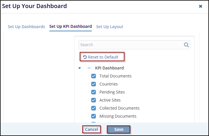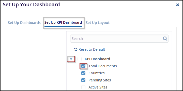 The Set Up KPI Dashboard allows users to configure key performance indicator (KPI) metrics on the user’s dashboard. The selected dashlets are displayed in the top right corner of the screen.